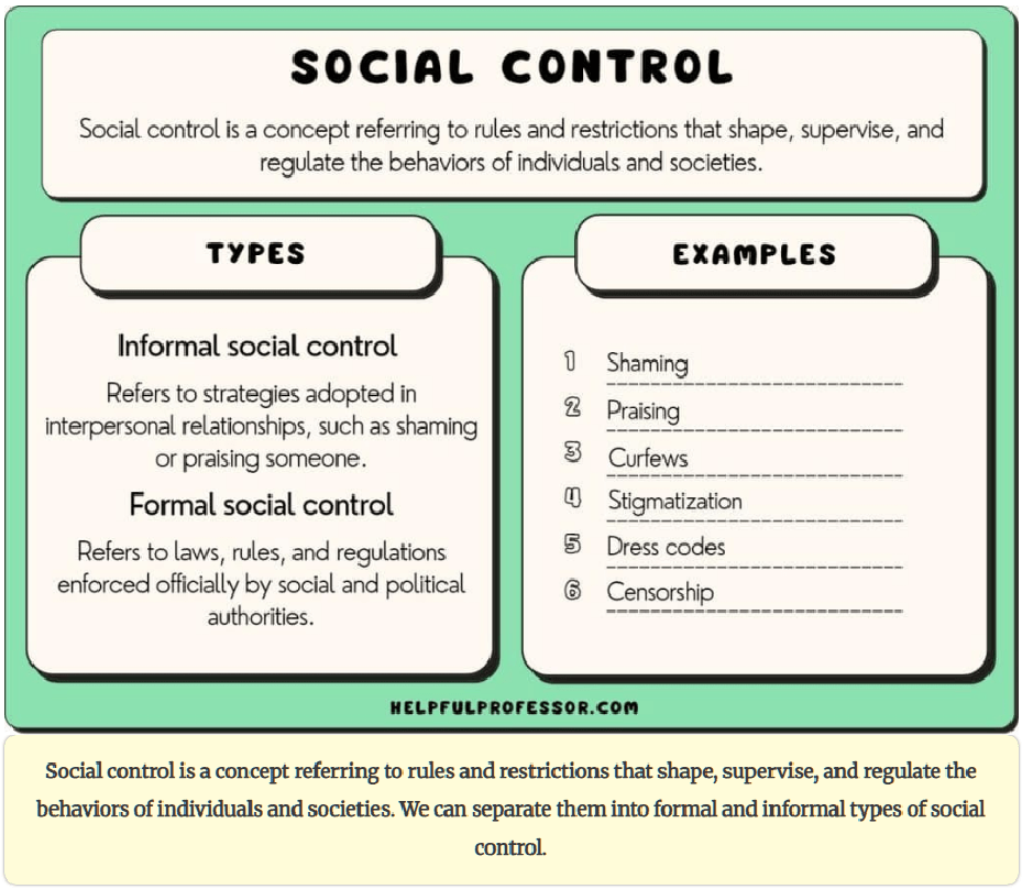 Social Control Examples Media representation: Negative media representation has the effect of stigmatizing social groups and pushing them to the margins of society.